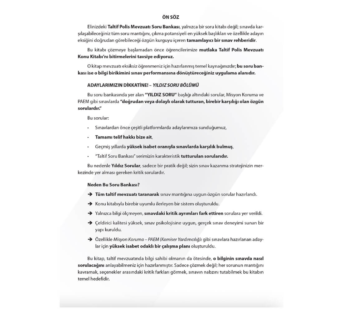 Taltif Polis Mevzuatı Soru Bankası, PAEM ve Misyon Koruma sınavlarına hazırlanan adaylar için özel olarak hazırlanmış, özgün ve yüksek isabetli sorulardan oluşan bir sınav rehberidir.
